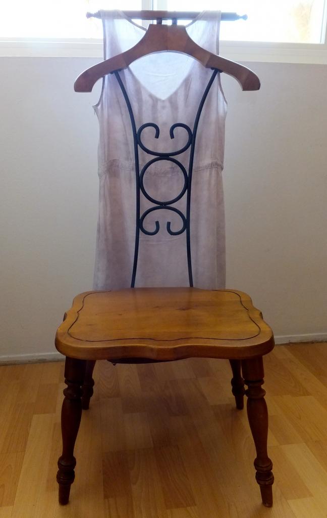 Who doesn't have the perpetual disarray of clothes in the bedroom, not going into the closet for some reason, but not into the hamper for another? So these clothes are in temporary limbo, and there's never a good place for them. In our master bedroom, a perfectly good chair and a perfectly usable chandelier serve as holders for those clothing items. Not anymore for Pia, for the Butler Chair was built for the purpose. It has a clothes hanger back with a second piece above and can take care of those stray clothing items elegantly. The seat is a bit lower, so you can comfortably reach your feet while putting on socks and shoes, and when seated you can effortlessly slip into the jacket hanging from the clothes hanger back. Simply genius! And then there's the secret compartment under the seat. Pia is in love!