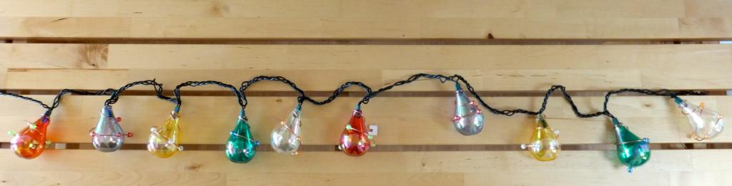 The iridescent teardrop garden lights strung out on our bench, before I mounted them in the backyard. |