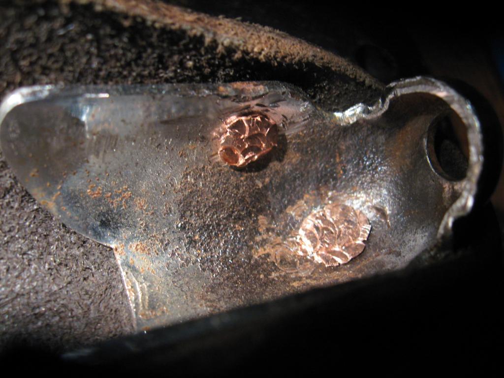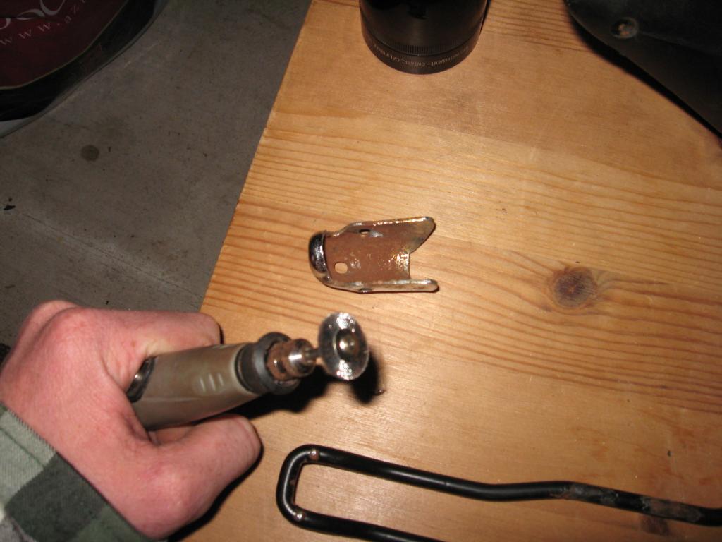 Starting at the back end of the saddle I ground all the flared rivet ends off. (Note: I shot the pictures for this step after I had already finished it, so I am using the pictures of the nose of the saddle, the rear end of the saddle rail has 6 rivets.) When a rivet is ground off it will look like this. Grind all six rivets on the back of the saddle. |