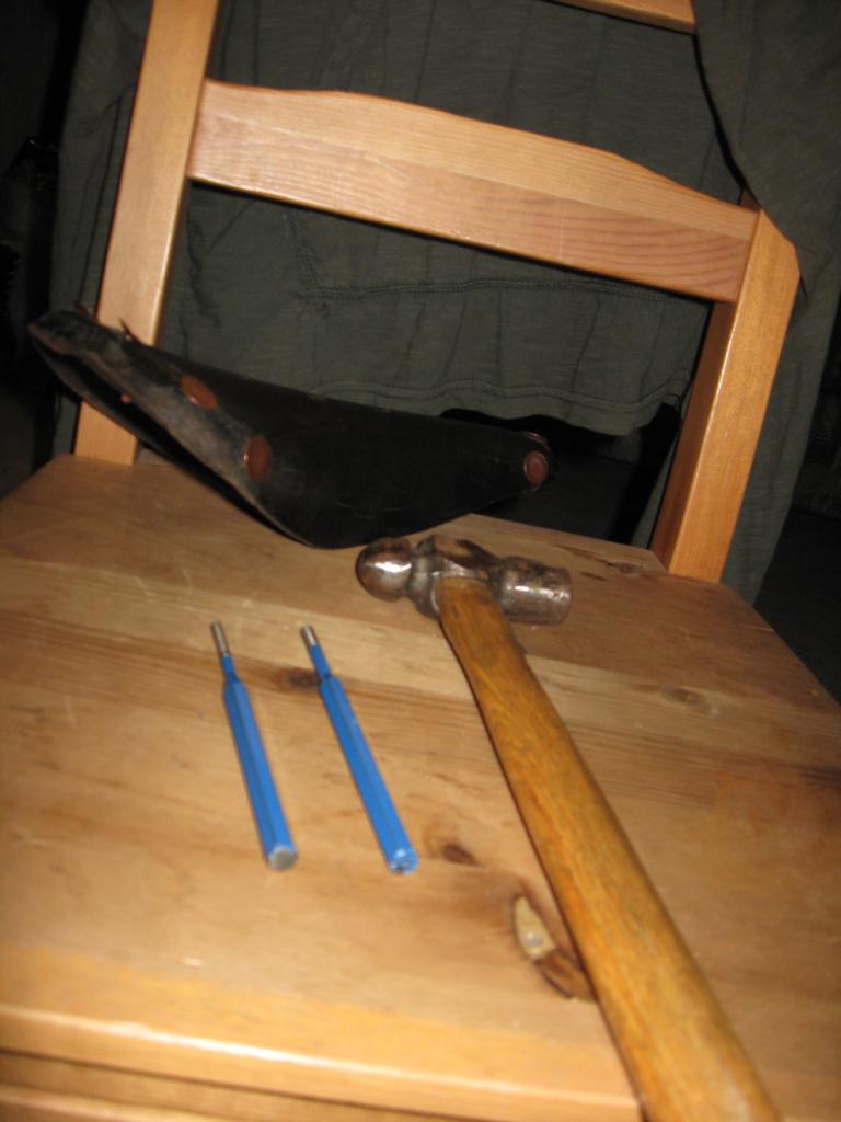 The idea of setting a rivet is to have the right length of shaft (about 1/8th inch) sticking through the two pieces being joined and then hammering the shaft so it flares outwards, thereby clamping the two pieces between the factory made head and the one you are forming with the punch. Rivets come in solid or hollow shaft, difference being strength and ease of installation. Solid rivets like I used are installed with a special type of punch that has a hemispherical depression in the end so it forms a nice round head while flaring. I was impatient and had no immediate access to the correct punch so I used a normal flat tipped punch. The end result is not as beautiful of a head (then again it is the underside of my saddle) and if not done carefully could result in a weak rivet set, so I would recommend using the correct punch. Hollow rivets are installed using a rivet gun, these are much easier rivets to install due to the unique tool.
