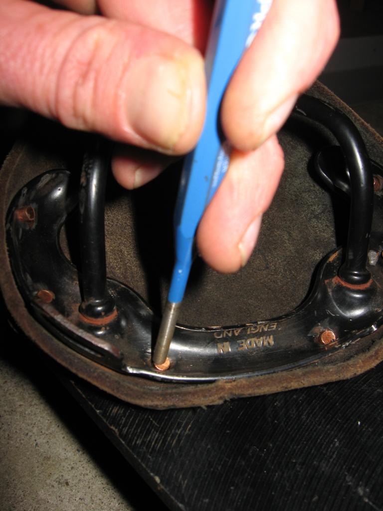 Use needle nose pliers to pull the ground rivets out of the leather. If needle nose pliers cant grip the head of the rivet, push from the bottom. I would not recommend using a knife or screwdriver to pry between the head of the rivet and leather because it causes damage to the leather (my leather is cosmetically not pristine, I am not striving for looks, only comfort, but I want to keep it as strong as possible for long-term use). |