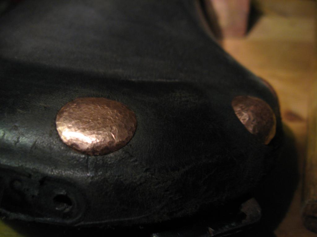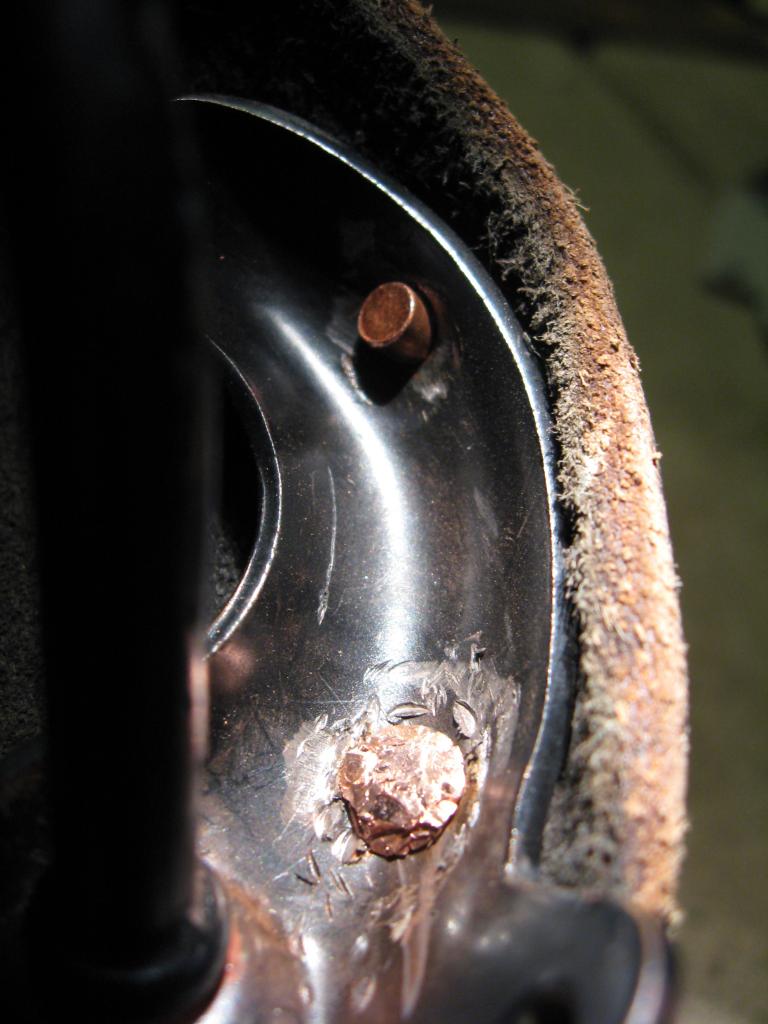 Because I used the largest copper rivets Brooks sells I had a gap between the leather and the edge of the rivet. This is normal because of how the rivet is formed, however if the gap is too big, the rivet might not be set tight enough or the rivet head on the top of the saddle might become a large bump after finishing that will be a nuisance while riding. When using rivets that already have a finished head, there should be no gap. |