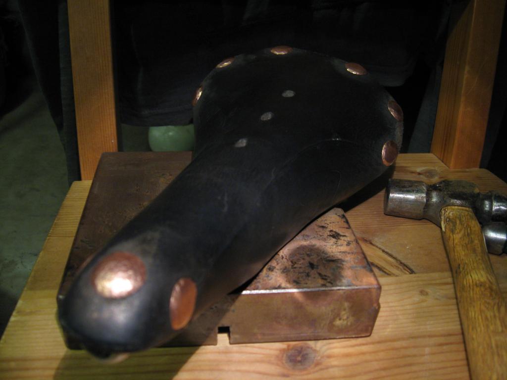 In order to finish a rivet, set the bottom head (underside of the saddle) onto an anvil and use the rounded end of the ball peen hammer to form the head of the rivet to fit the contour of the saddle.