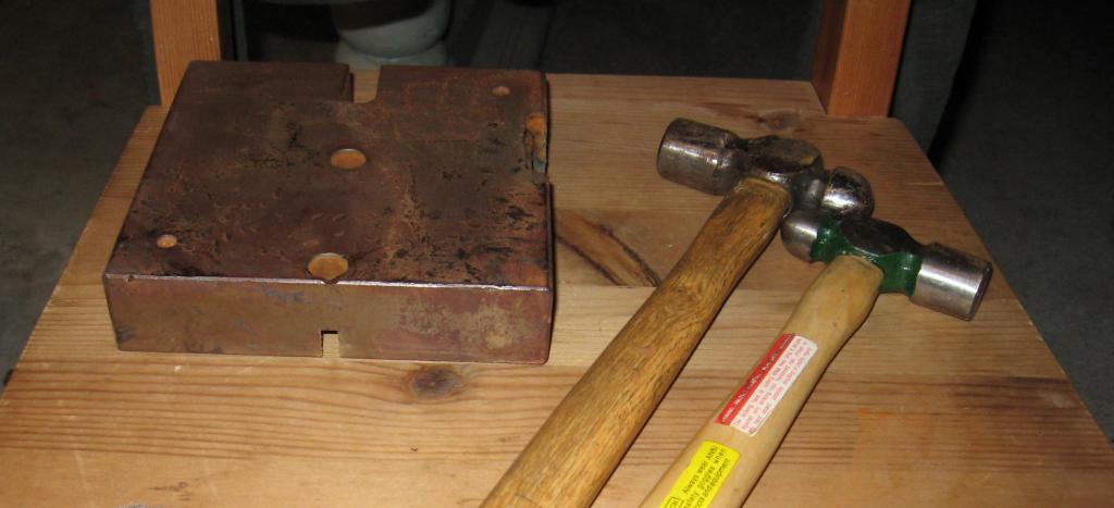 This is the homemade anvil that I used. It is a large chunck of cast iron that I placed onto the concrete foundation at my house. I recommend a real anvil, but I am poor and have access to scrap metal. |