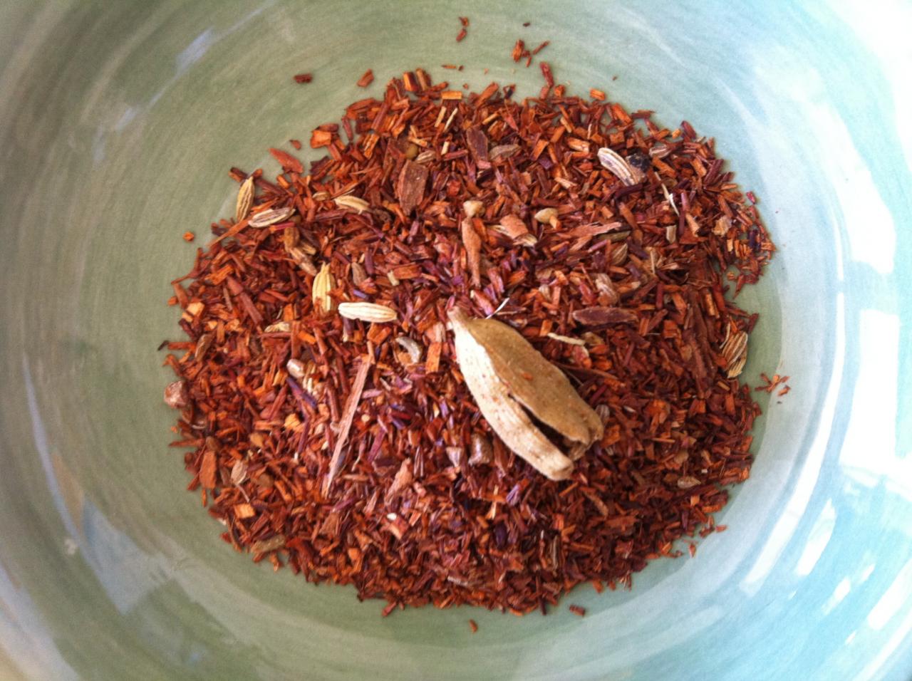 Grind the spices in a mortar or grinder until you have small pieces (not powder). The cardamom pods, albeit flattened and freed of the seeds will remain mostly whole, as seen in the image. Enjoy the delicious smell, it's part of the fun! Spoon the spices into the rooibos tea and mix as you go. Transfer the mix into a tin or jar where it is protected from light and air and remains fresh.