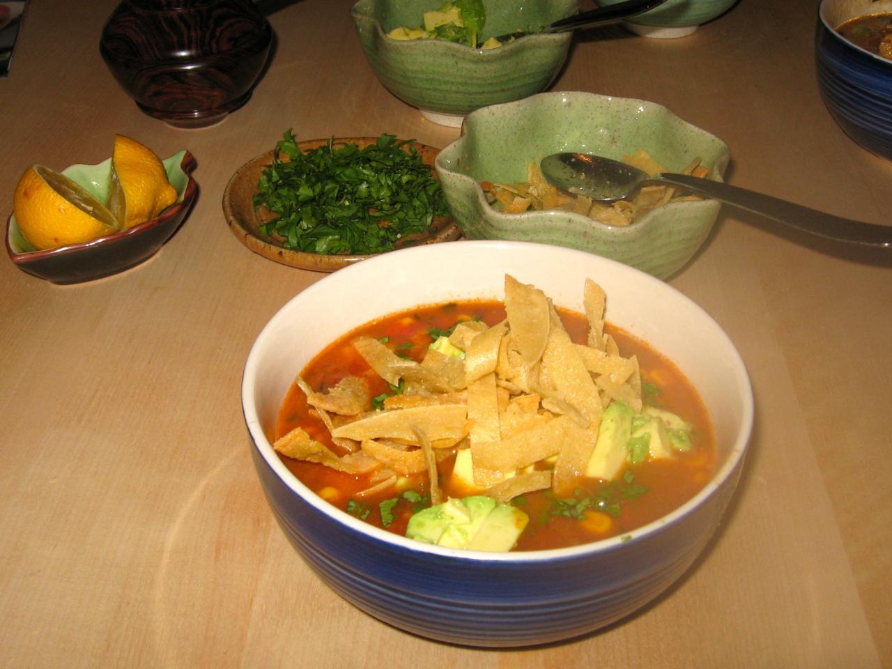 Ladle some of the soup into a bowl. Top with cheese, if desired. Squirt a bit of lemon juice over the soup, sprinkle on some chopped cilantro, and then finish off with some diced avocado and tortilla strips.